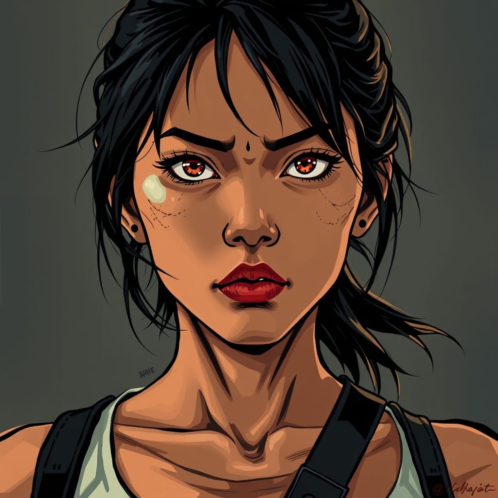Cynthia Rivera (Filipina) Facial Features: Angular face, intense eyes filled with grief and fury, light scars from past trauma. Hair: Messy shoulder-length black hair, sometimes tied carelessly. Physique: Average build, hardened by years of planning and fighting back; stands at 5’5”.