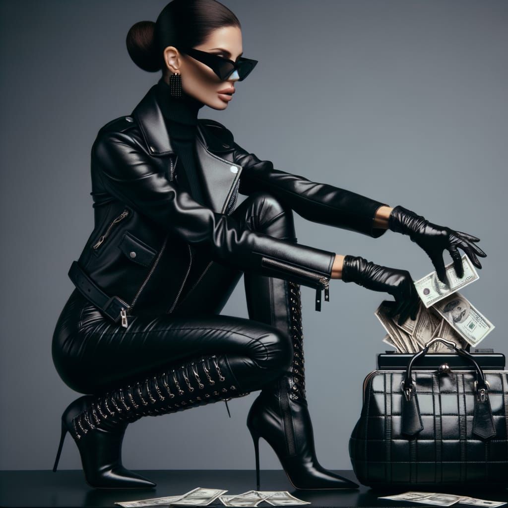 This image shows a stylish woman in a black leather outfit, calmly stealing cash from registers and stuffing it into a designer handbag, exuding confidence and poise.