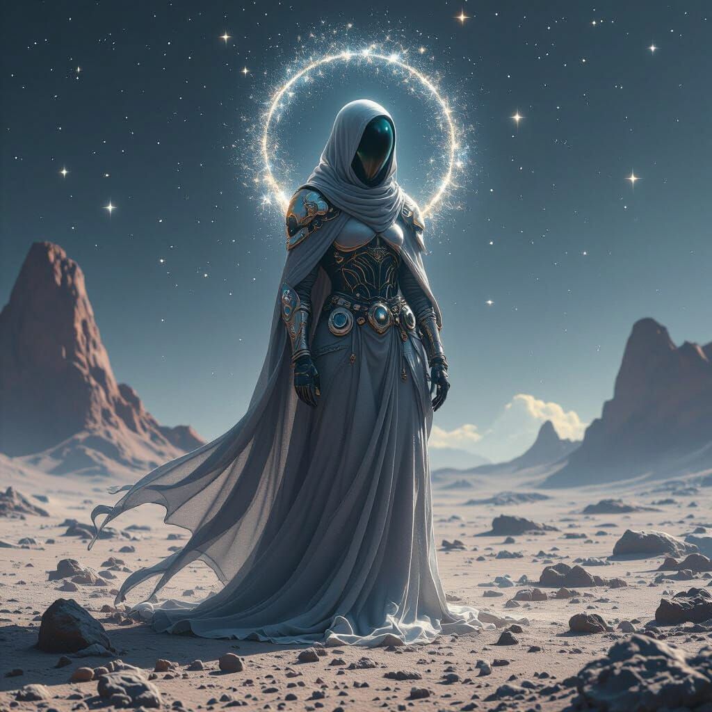 This image depicts an ethereal figure on a desolate asteroid, wearing robes of volcanic glass and smoky quartz armor. A halo of stardust surrounds them, rendered with a cosmic and futuristic aesthetic.
