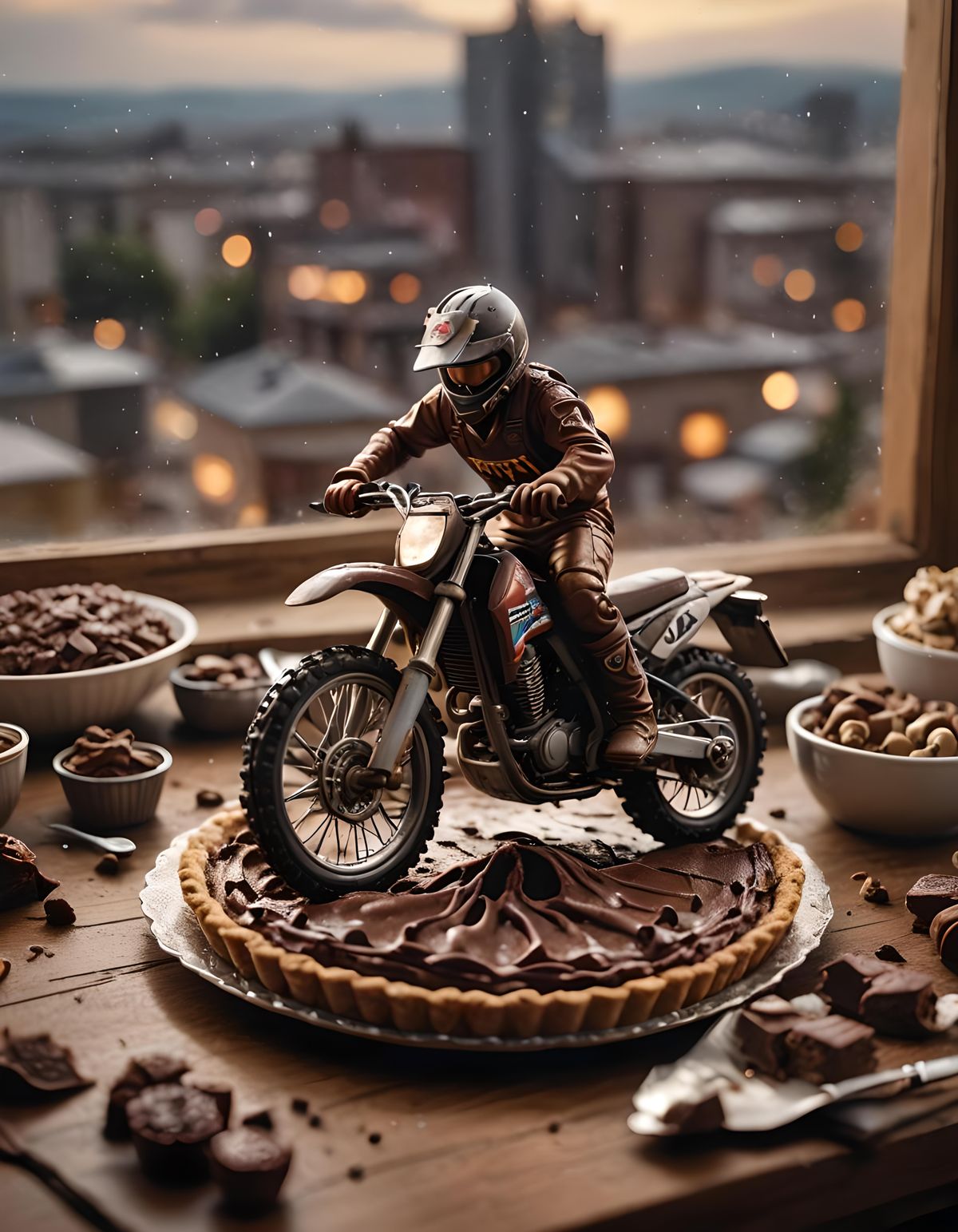 A dramatic digital painting of a massive chocolate pie on a kitchen table. A miniature motocross rider figure is placed on the pie. Natural lighting and bokeh create a cinematic atmosphere.