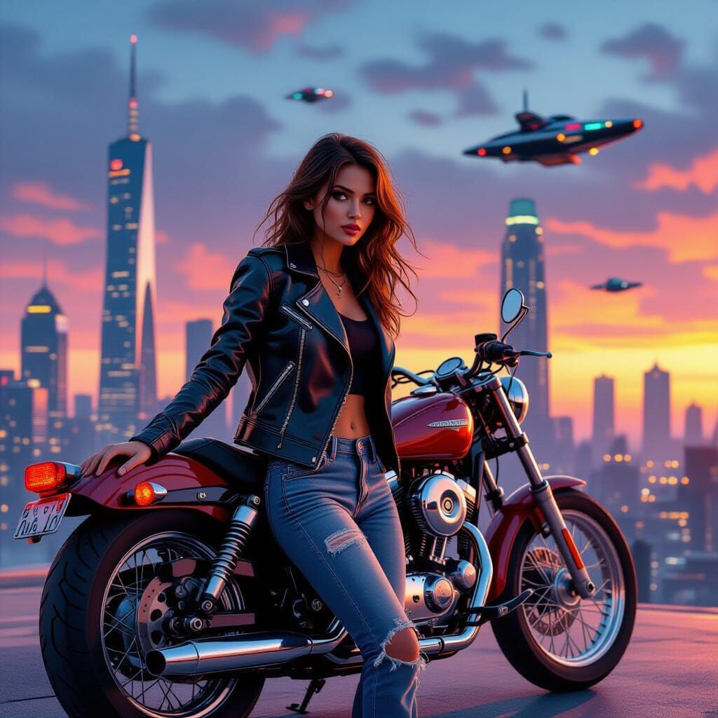 This image shows a young woman in a leather jacket leaning on a motorcycle in a futuristic city. The digital art features vibrant colors and intricate details, with dynamic lighting.