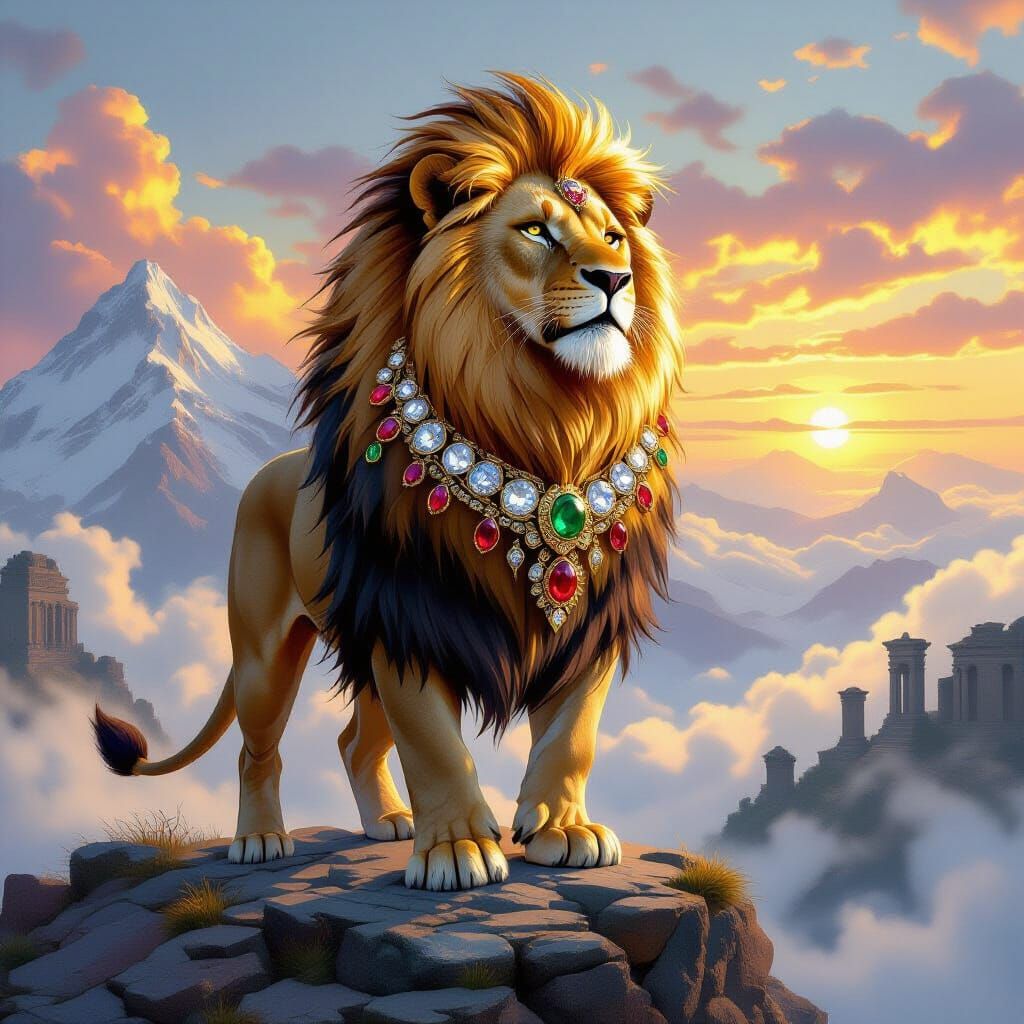 A hyperrealistic image shows a golden lion adorned with jewels standing atop a misty mountain at sunrise. The mane is made of diamonds, rubies, and emeralds, with ancient ruins visible in the distance, in an ornate art nouveau style.