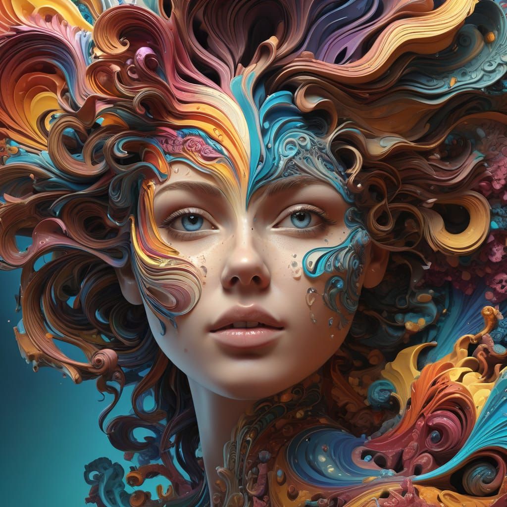 This image shows a hyperrealistic portrait embodying subconscious archetypes. The artwork features intricate details, dramatic lighting, and a colorful, abstract fractal background with 3D shading.