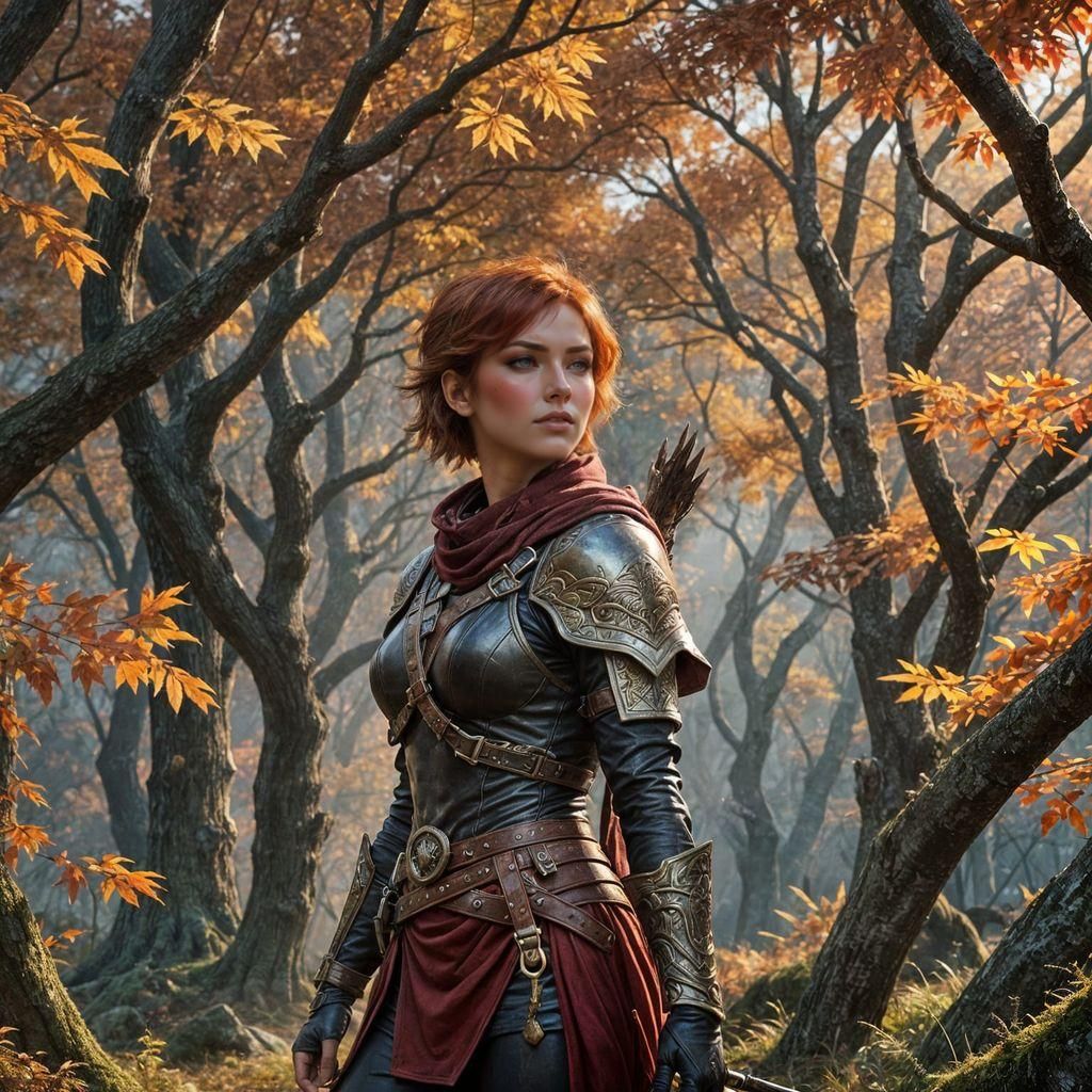 A striking picture of a beautiful fantasy ranger in an autumnal forest. This detailed portrait features dynamic lighting and a rich color palette, reminiscent of trending digital art.