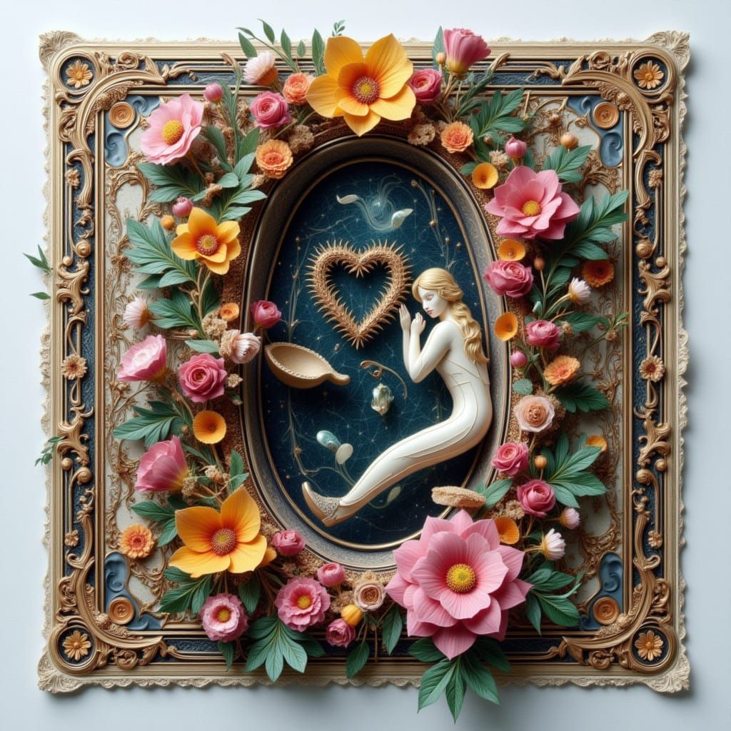 This image showcases steamfunky anamorphism, featuring a rusticated paper tole style. It presents a beautiful yet dangerous composition, suggestive of a digital glitch or artistic interpretation.