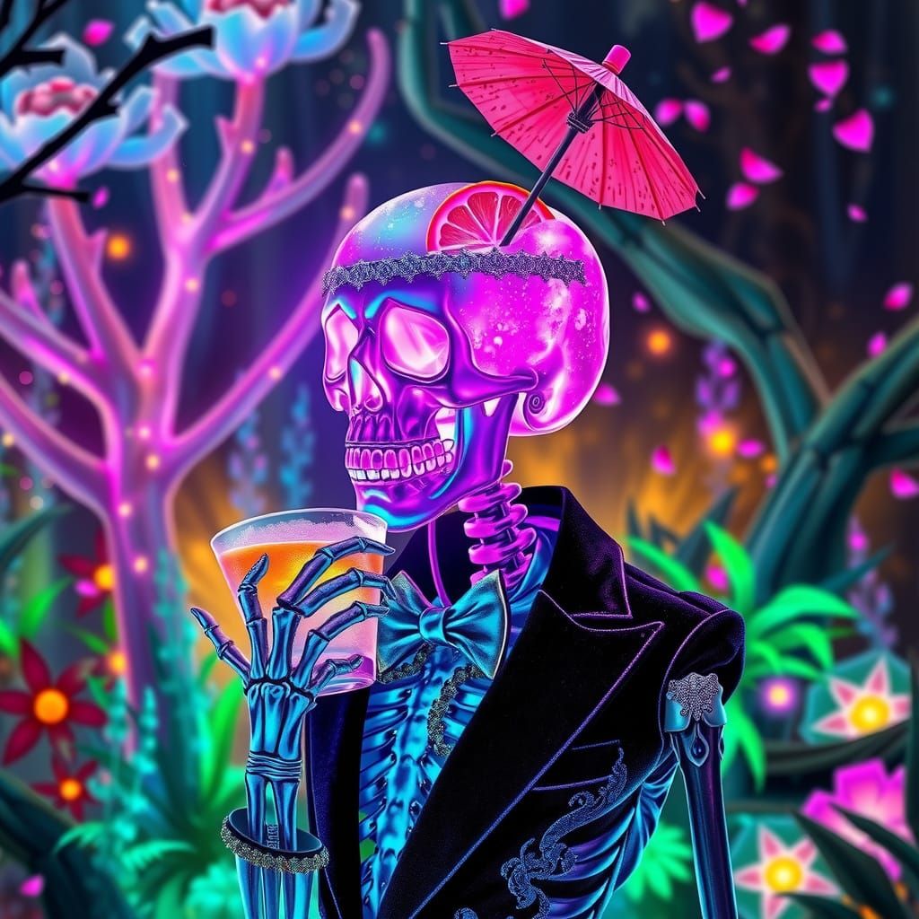 This image shows a crystal skeleton in a velvet suit holding a skull cocktail glass. It's set in a dreamlike forest with glowing flora, rendered with hyperrealistic, futuristic neon aesthetics.
