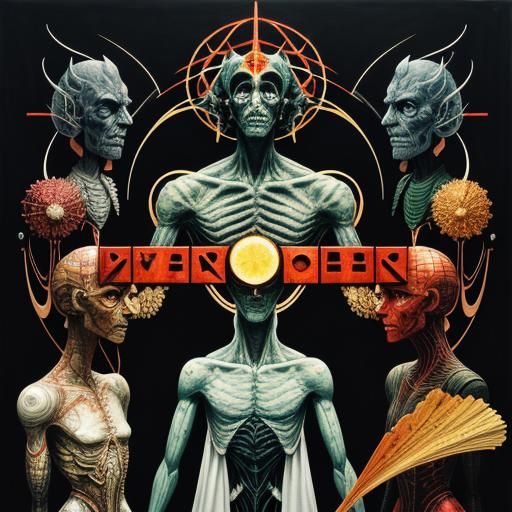 This image is a vibrant 3D render with organic shapes in black, white, red, gold and other colors. The artwork has a Dada, Expressionist, and abstract style with fine details and dark shadows.