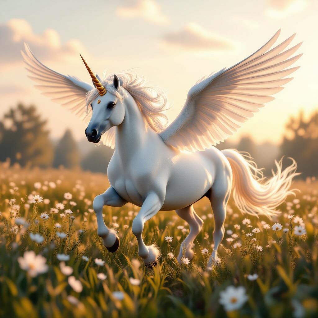 A beautiful image of a winged unicorn prancing through a field of wildflowers. The creature is bathed in soft morning light with a warm ethereal glow, in the style of Fragonard.