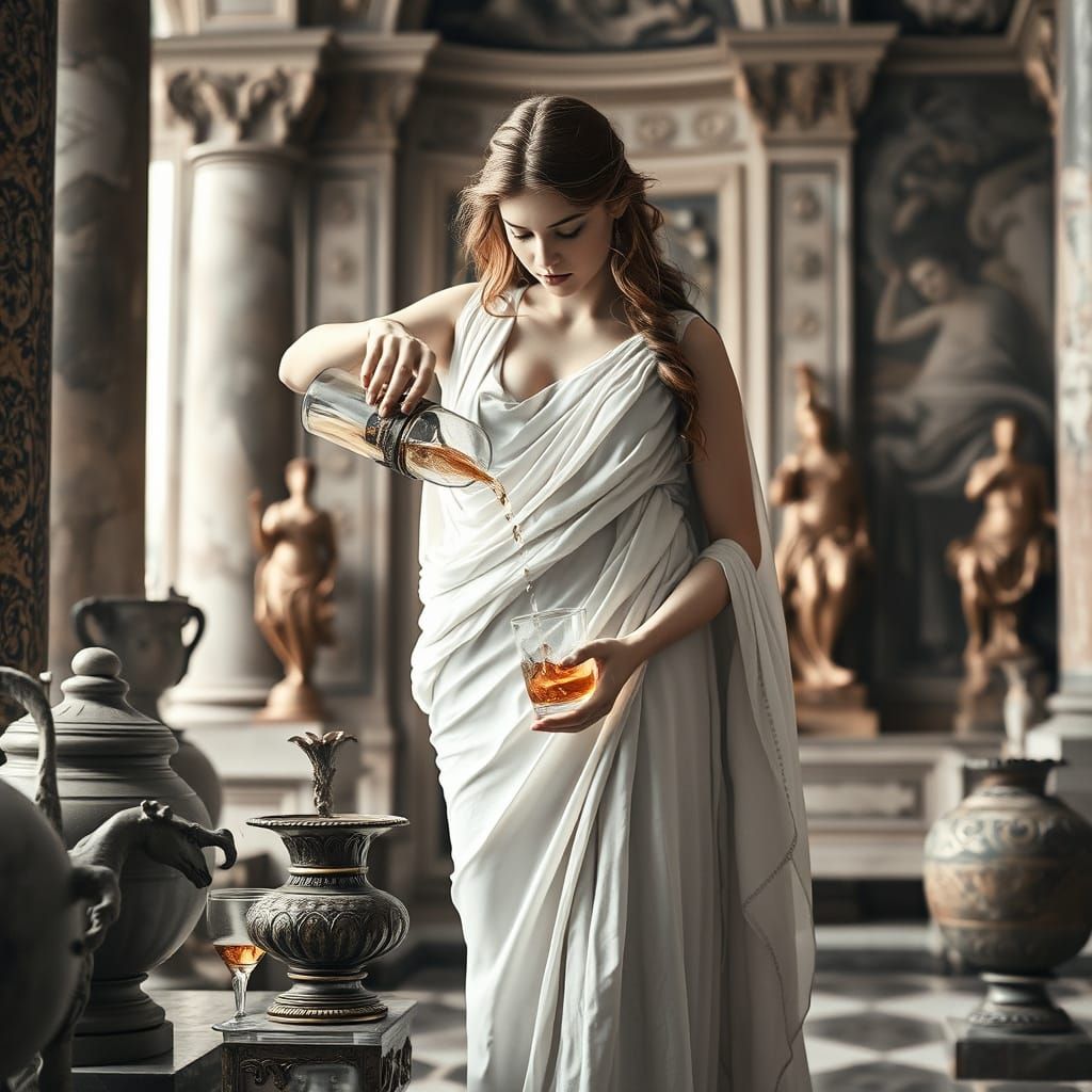 A monochrome image of Aphrodite in an ancient palace. She is dressed in a toga and pouring liquid between glasses, in a soft pastel watercolor style reminiscent of classical art.