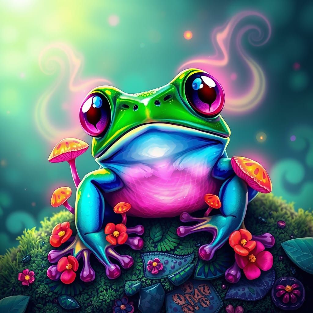 This enchanting, hand-drawn digital artwork features a mesmerizing frog radiating vibrant, dreamlike energy, surrounded by swirling patterns and ethereal glow, set against a lush, surreal background transporting the viewer to an otherworldly realm.