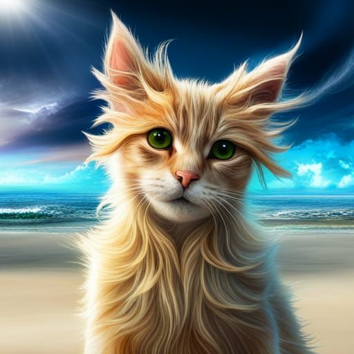 This image shows a cat enjoying the summer breeze on a beach. The scene is rendered as a detailed matte painting with deep, complementary colors in a fantasy concept art style.