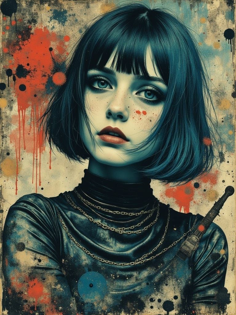 This image shows a gothic portrait of a melancholic young woman with short blue hair. The aesthetic is a colorful mix of abstract, surreal, and psychedelic elements.