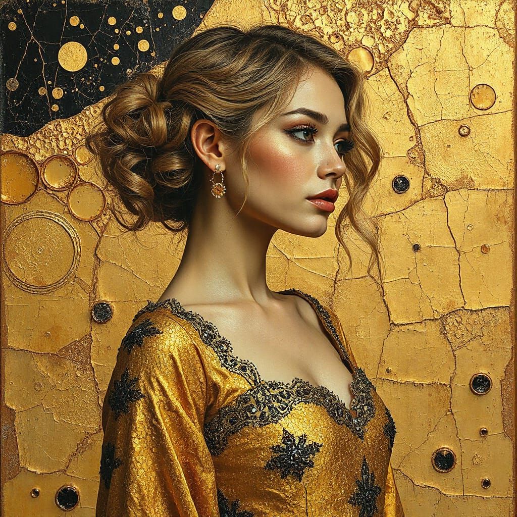 This image shows a desert princess with golden hair in a shimmering gold gown. The artwork evokes Klimt's style through mixed media and intricate textures, rendered in metallic tones.