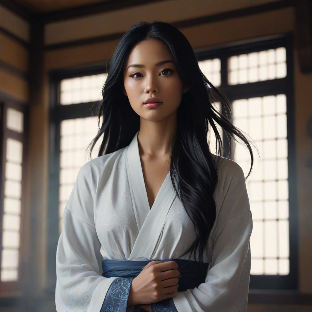 This vibrant anime illustration depicts a young nun monk warrior, Jamie Chung, in a serene classroom setting. Soft, golden tones and deep blues create a dramatic atmosphere, while subtle hints of spiritual energy surround her. The illustration features bold brushstrokes and intricate details, showcasing ...