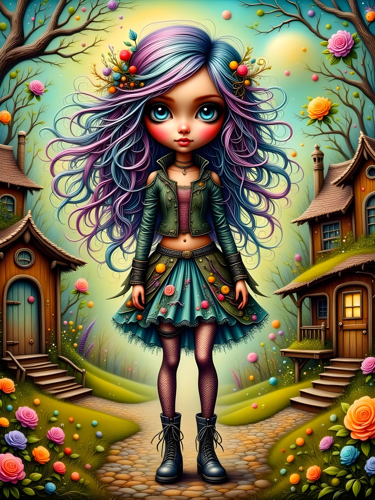 This image is a colorful digital artwork of a whimsical fairy with punk flair, standing in front of a ramshackle cottage, created with 3D textured impasto techniques.