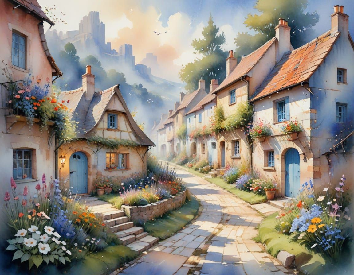 This image shows a whimsical fairy tale village with pastel cottages and cobblestone alleys, sparkling with magic. It's reminiscent of a watercolor painting with ethereal stylization.