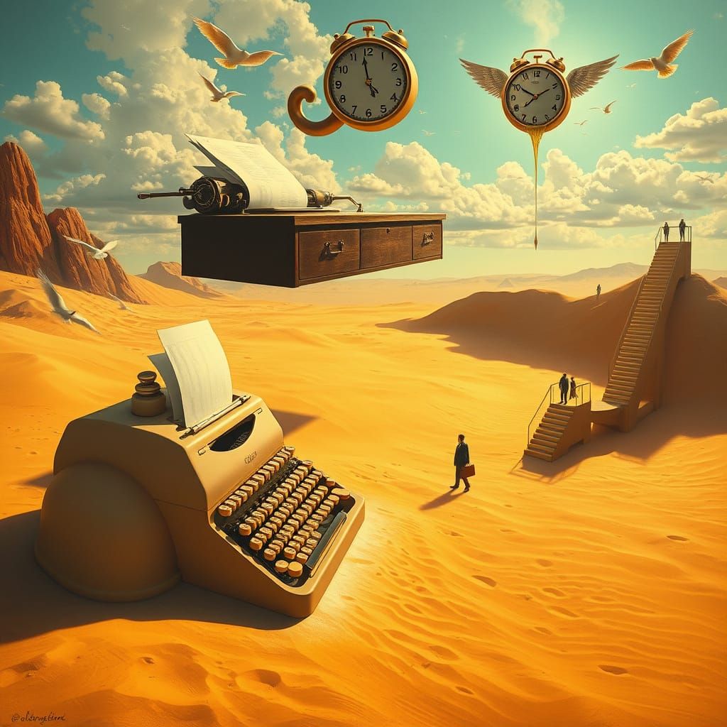 An oil painting captures a surreal desert plaza with melting objects, floating desks, and winged coffee cups. This dreamlike scene features Dali-inspired forms with warm golds and turquoise highlights.