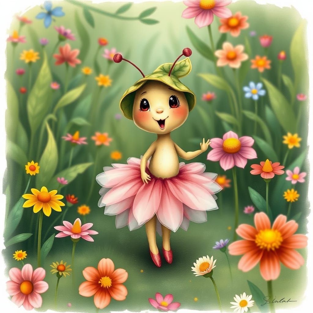 This image shows an excited caterpillar wearing a pink tutu and leaf hat in a vibrant garden. The illustration style evokes classic children's book art with whimsical and elegant touches.