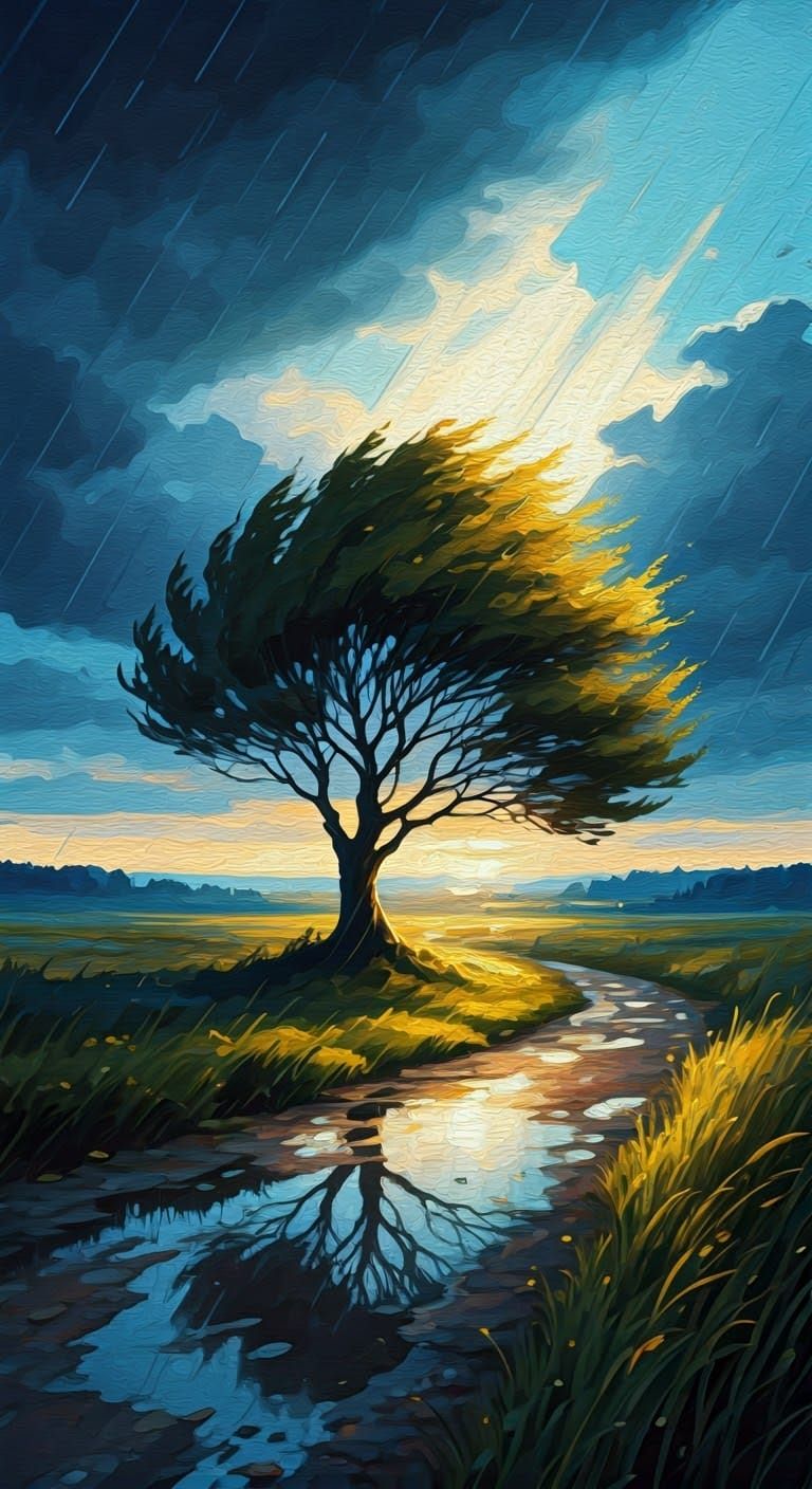 This image shows a serene landscape emerging from a storm, with a lone tree stretching towards the sky as warm sunlight casts a golden glow on the rain-soaked terrain, blending soft pastel blues and warm golds in a mesmerizing dance.