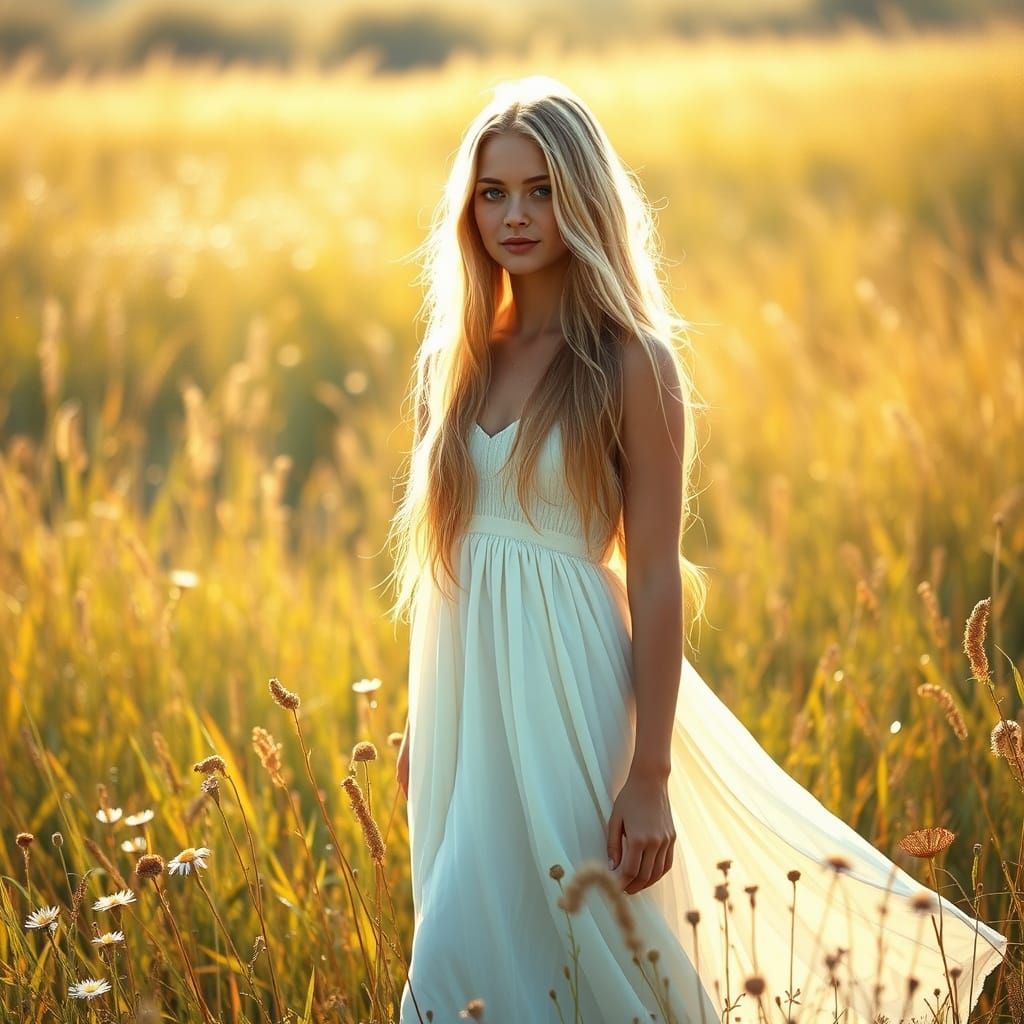 A timid young woman with long blonde hair in a white dress stands in a sun-dappled meadow. Rendered in a romantic, painterly style with soft lighting, this image evokes classical portraiture.