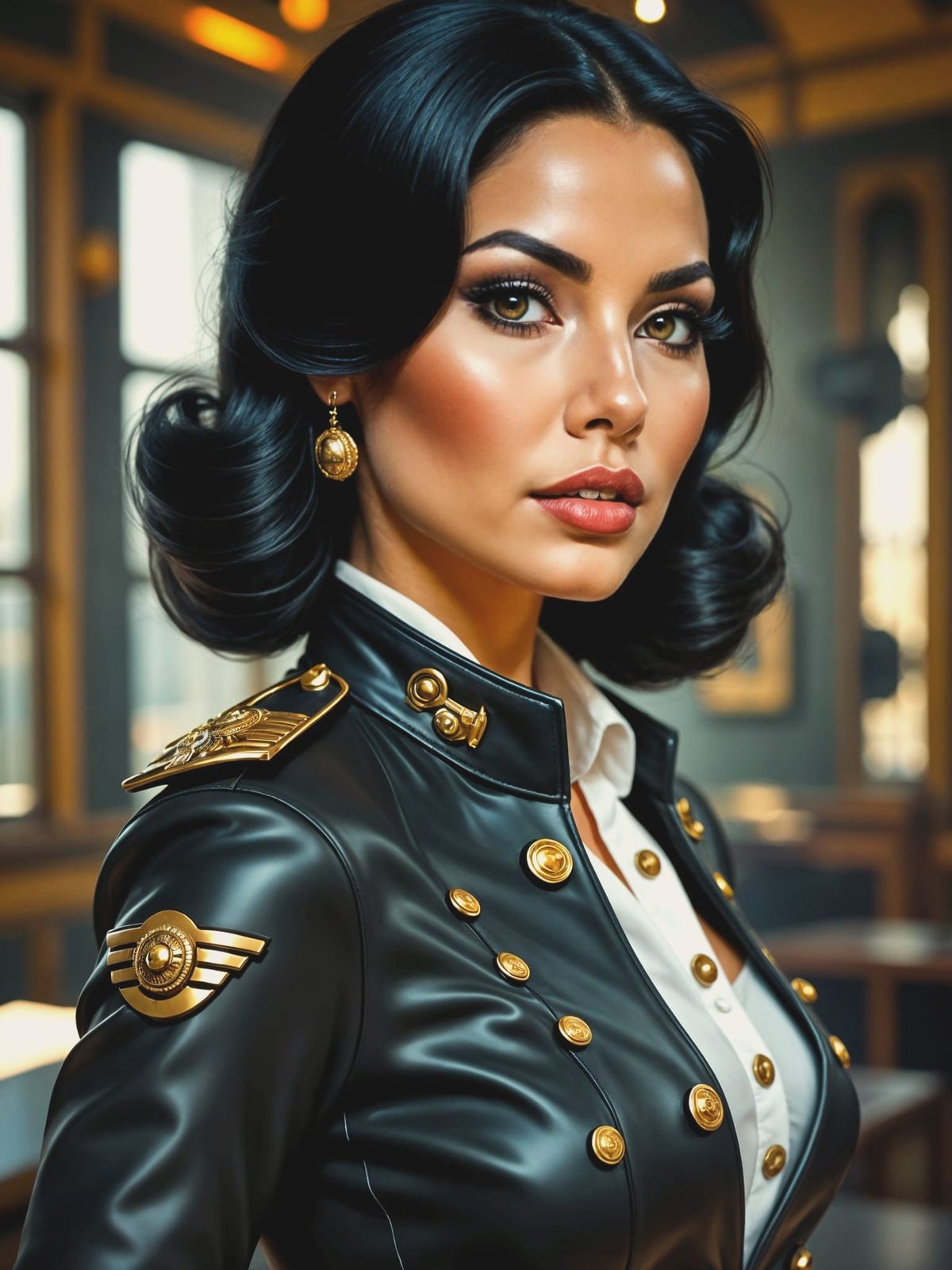 A striking portrait of a strong Mexican woman in a steampunk military jacket with brass buttons. Features vibrant colors, evocative makeup, and epic lighting against a bull ring background.