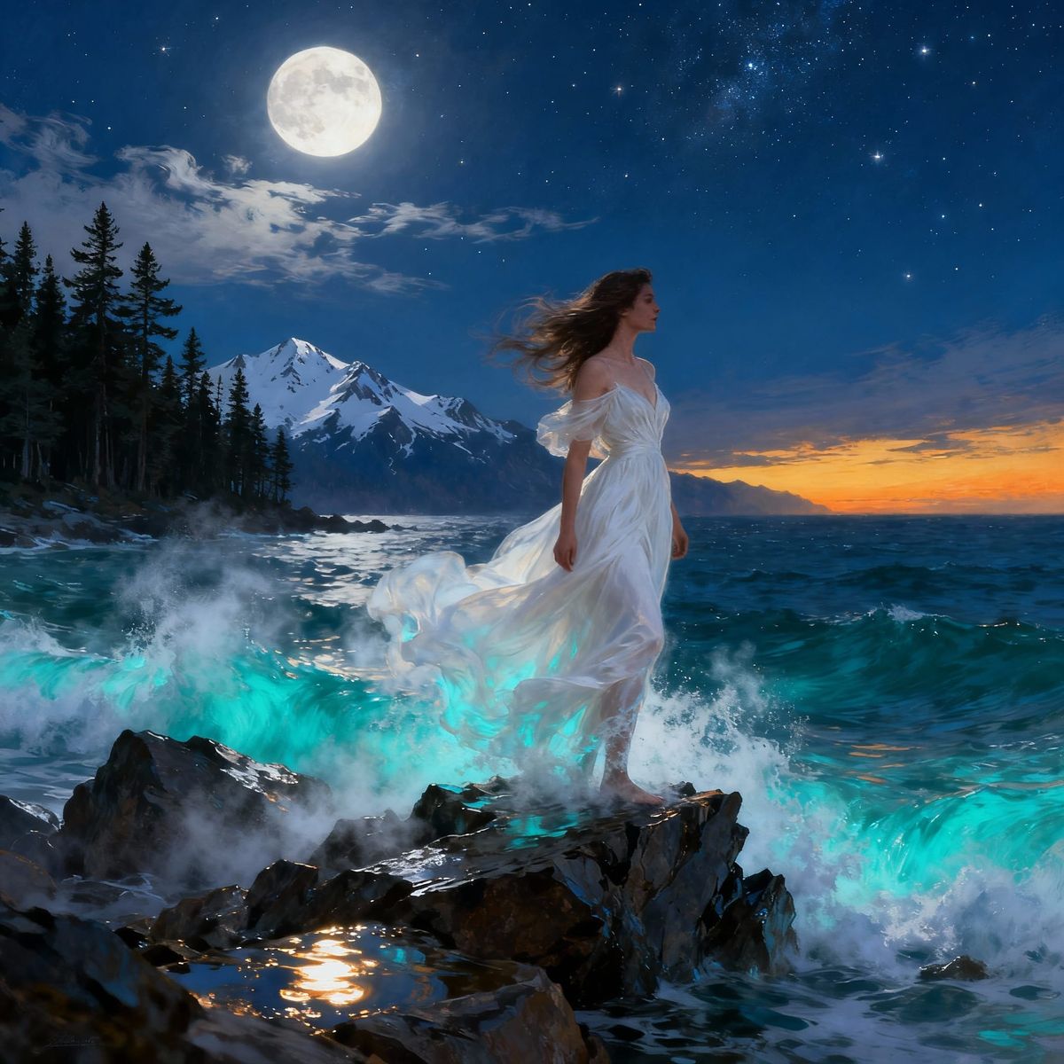 An ethereal fantasy illustration of a woman in a flowing white gown standing on jagged rocks at the edge of a moonlit sea. A night sky teems...