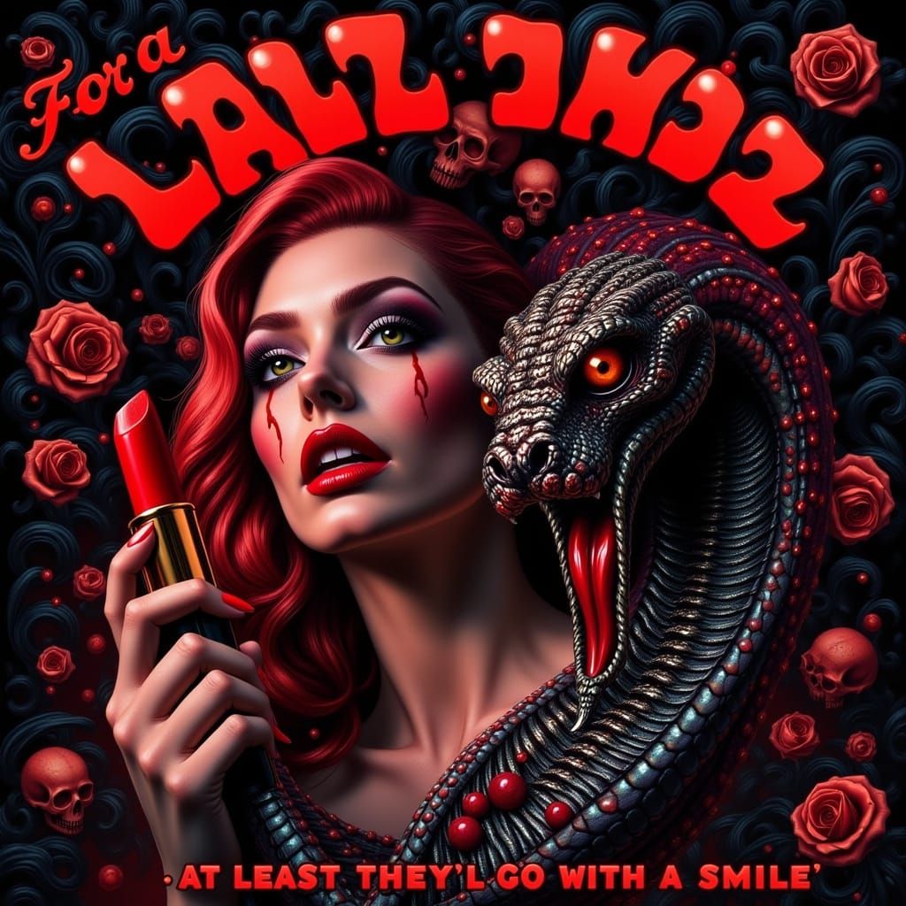 This image showcases a striking, hyper-realistic pin-up girl with vibrant red hair and gold serpent eyes, posing seductively amidst swirling black and red smoke, with a bold, dramatic aesthetic reminiscent of classic pulp comics.