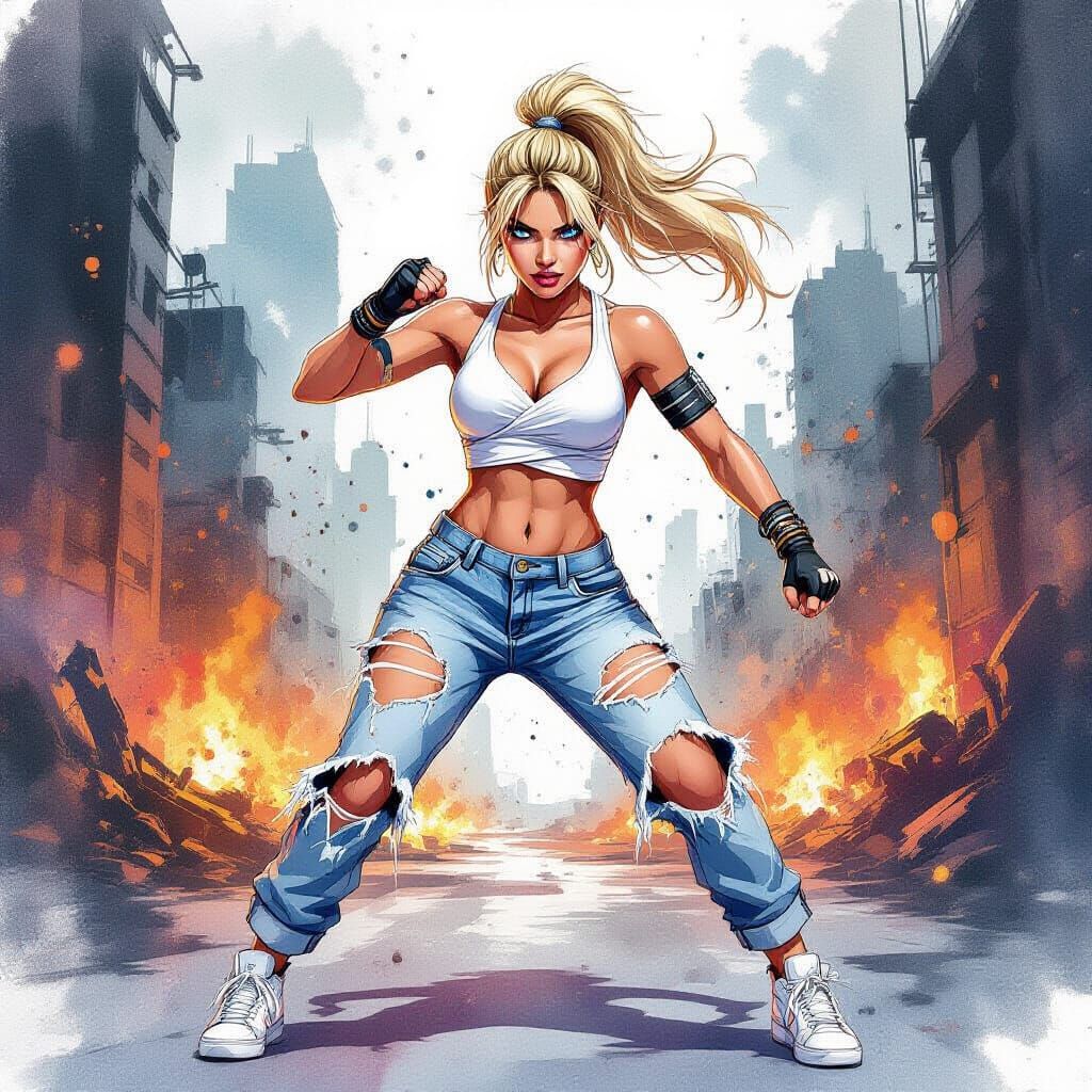 A dynamic image of a blonde female dancer performing against an apocalyptic urban background. She has radiant skin and fierce blue eyes, and the artwork features a vibrant watercolor ink splatter aesthetic.