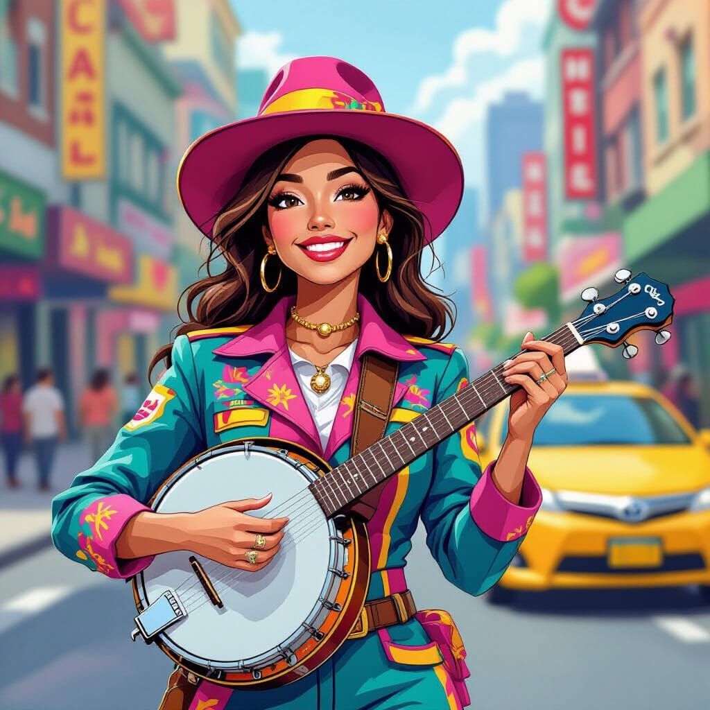A vibrant caricature of a female taxi driver playing a banjo in a bustling city street. The illustration features exaggerated features and bold lines, reminiscent of cartoon and comics art.