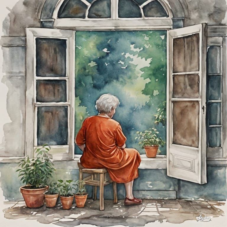 This image shows an elderly woman gently tending to potted herbs on a kitchen windowsill. Rendered as a warm, natural watercolor painting, it focuses on serene textures and soft light.