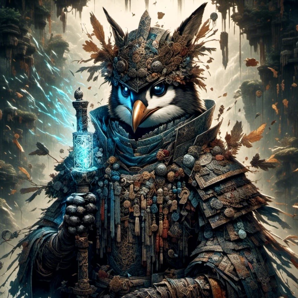 This image shows a penguin dressed as a knight holding cheese. The scene includes tattered elements, magic, and glowing runes, creating a whimsical portrait.