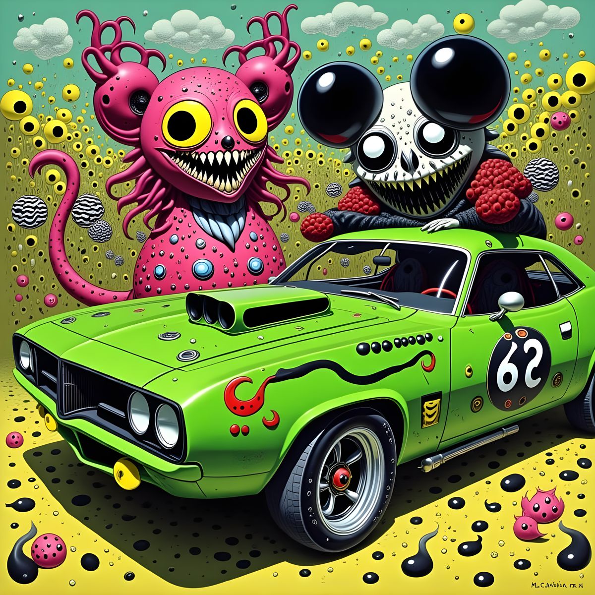 A Ratfink-style cartoon of a 1970 Barracuda driving. This image features bold and exaggerated cartooning reminiscent of 1960s hot rod art, with custom visual effects.