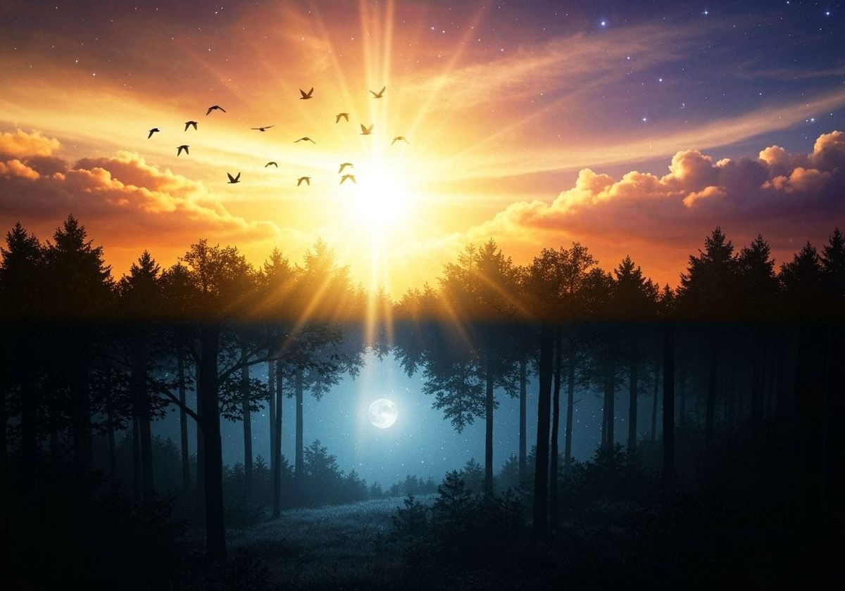 This image shows a surreal landscape divided into night and day. The bottom half features a cool-toned nighttime forest, while the upper half has a bright, sunny sky, as surreal digital art.