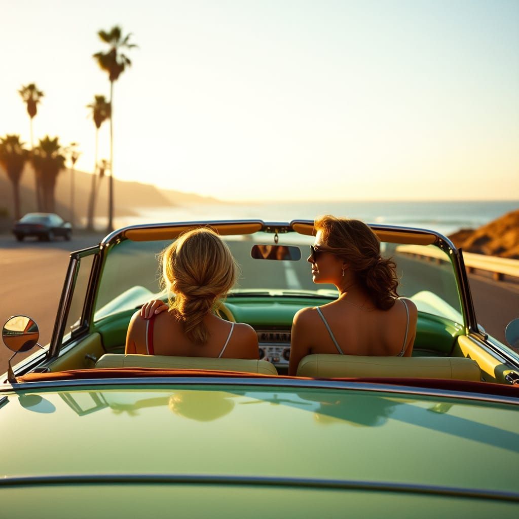 This image shows two women in a classic car driving along the Pacific Coast Highway. The photo features a soft focus and warm lighting, reminiscent of vintage film photography.