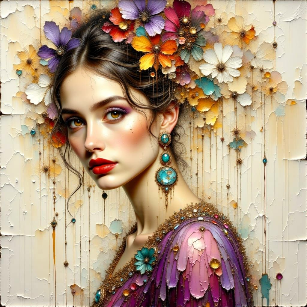 This image shows a modern woman in a 3/4 portrait, depicted with soft red, plum, turquoise, gold and white colors. It is rendered as an impasto oil painting with craquelure texture and volumetric, hard brush strokes.