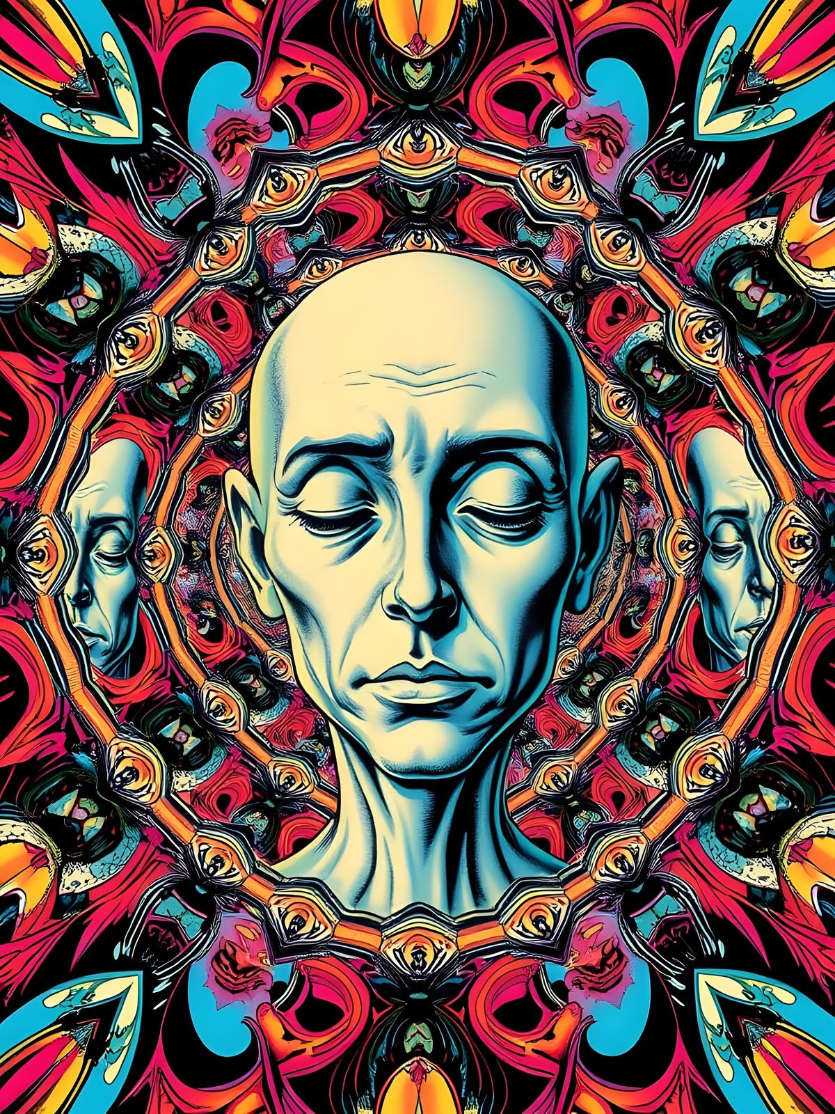 This image shows a vibrant, psychedelic self-portrait of a ki, echoing the infinite regression of the Droste effect, with a dash of biomechanical surrealism and underground comix style, reminiscent of psychedelic colors and erratic lines.