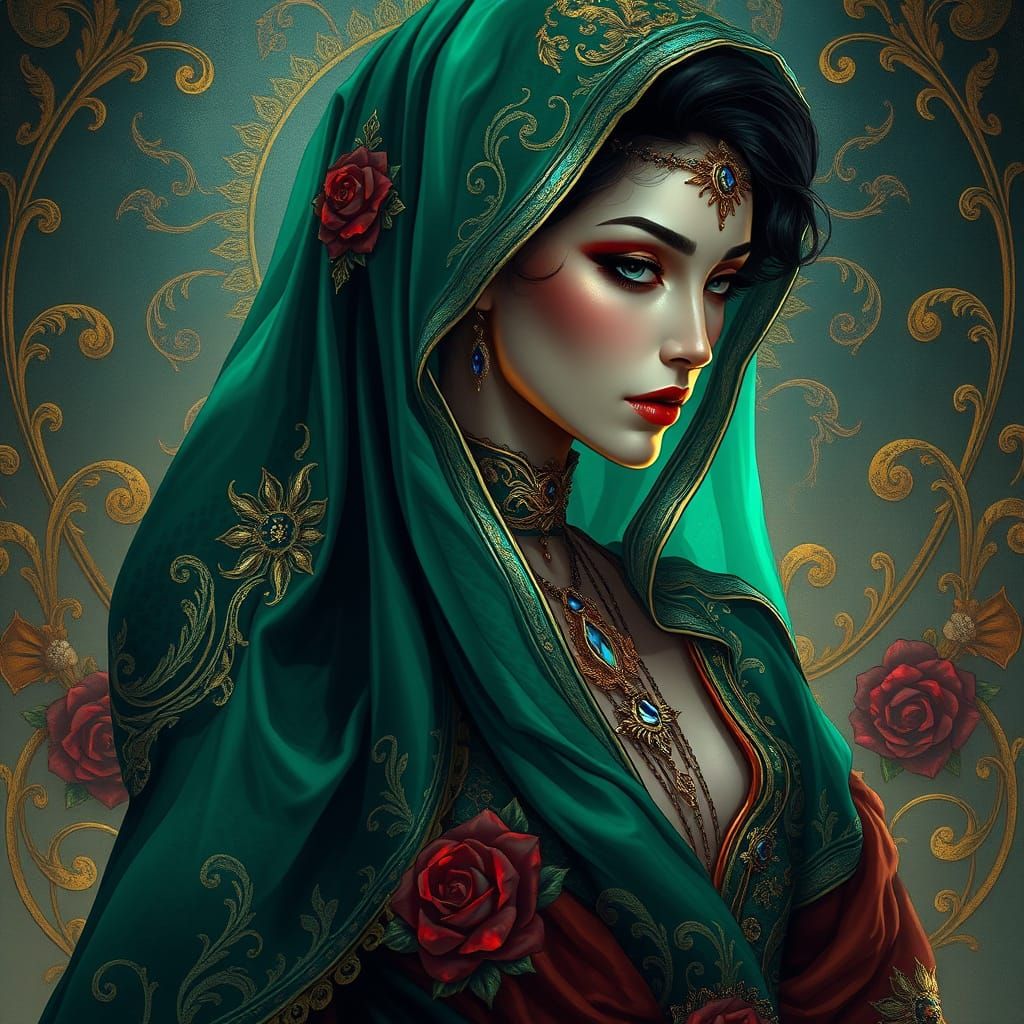 This image features a mystical androgynous figure draped in ornate, vibrant attire reminiscent of Byzantine mosaics, with intricate details and rich textures, set against a backdrop of atmospheric lighting and symbolic motifs.