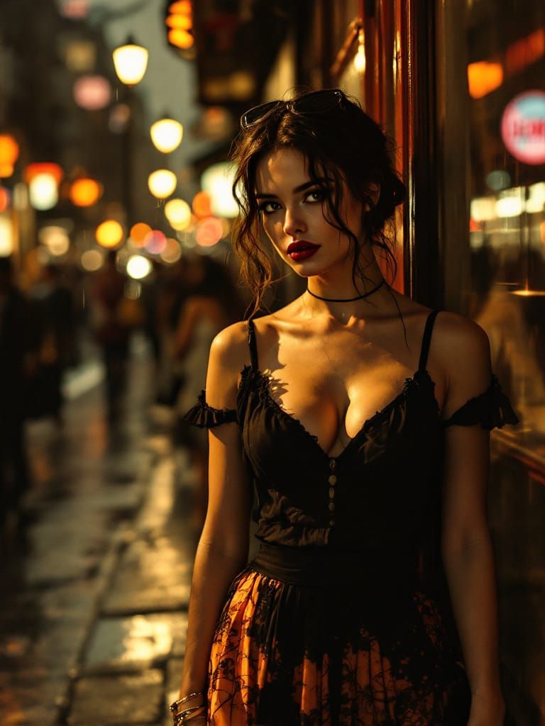 This image features a 1950s pin-up woman in a city setting, rendered with a luminous, distorted aesthetic combining painterly warmth and hyperrealistic clarity. Amber light refracts through veils, creating an eerily intimate atmosphere.