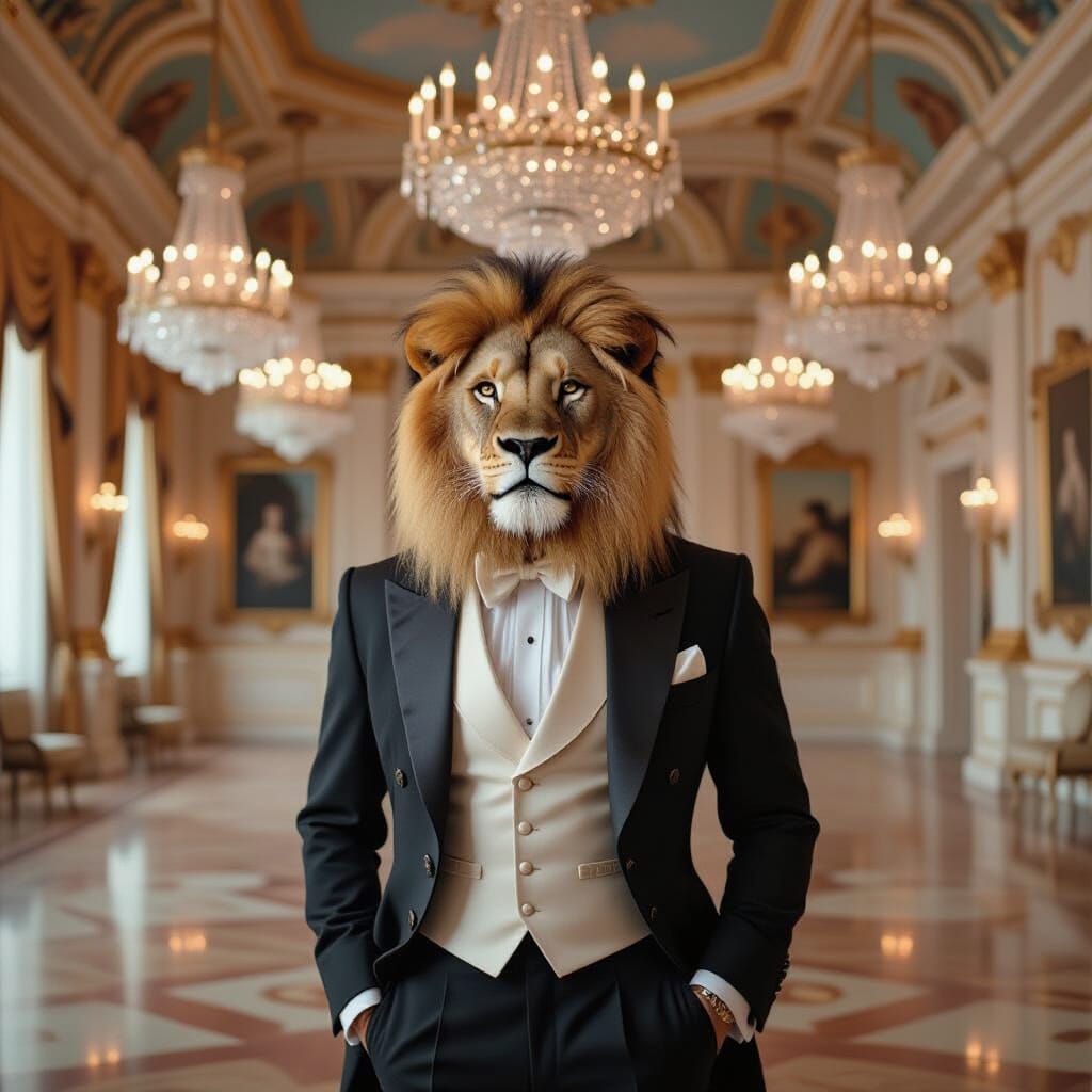This image shows a regal lion in a suit, posed in an opulent ballroom. The artwork evokes a surreal and whimsical aesthetic with pastel colors and symmetrical composition.