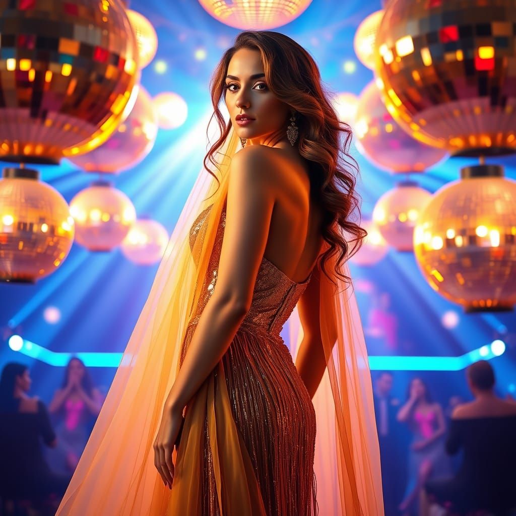 This image shows a woman in a golden gown surrounded by disco balls. The hyperrealistic portrait is rendered in vibrant neon colors, capturing a rainbowcore aesthetic with meticulous detail.