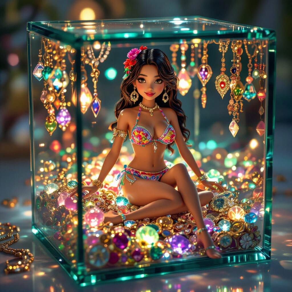 A hyperrealistic image of a miniature model in a vibrant bikini, posed inside a glass jewelry box filled with glowing glass jewelry. The image is rendered with soft lighting.