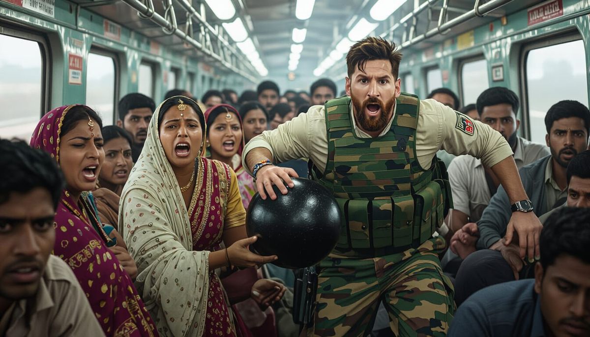 This image shows a crowded train filled with Indian men and women in traditional clothing, expressing fear and distress. Lionel Messi, in army fatigues, heroically grabs a ticking bomb in a gritty, photorealistic style.