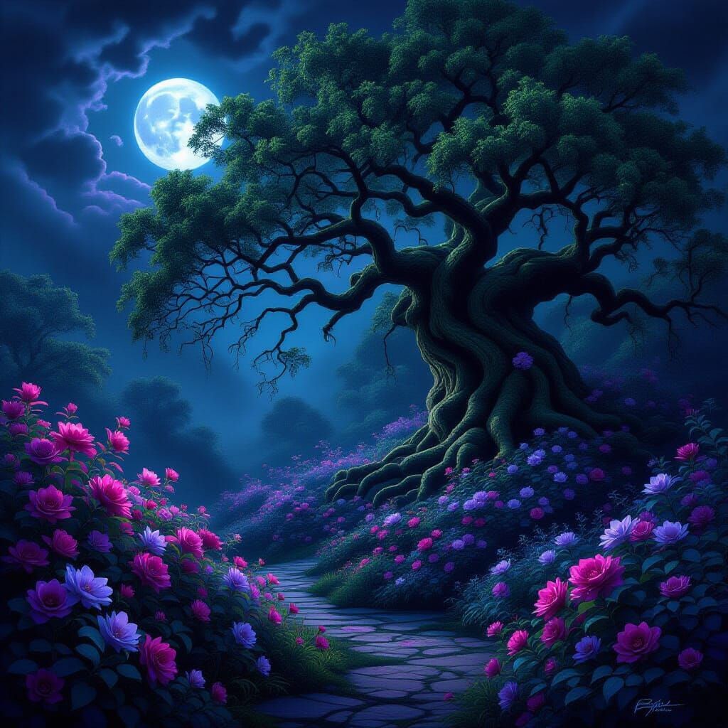 This image showcases a mystical garden filled with purple and pink flowers and a massive ancient tree. Ethereal glowing plants and a hidden moon create a dark, enchanting atmosphere with rich textures.
