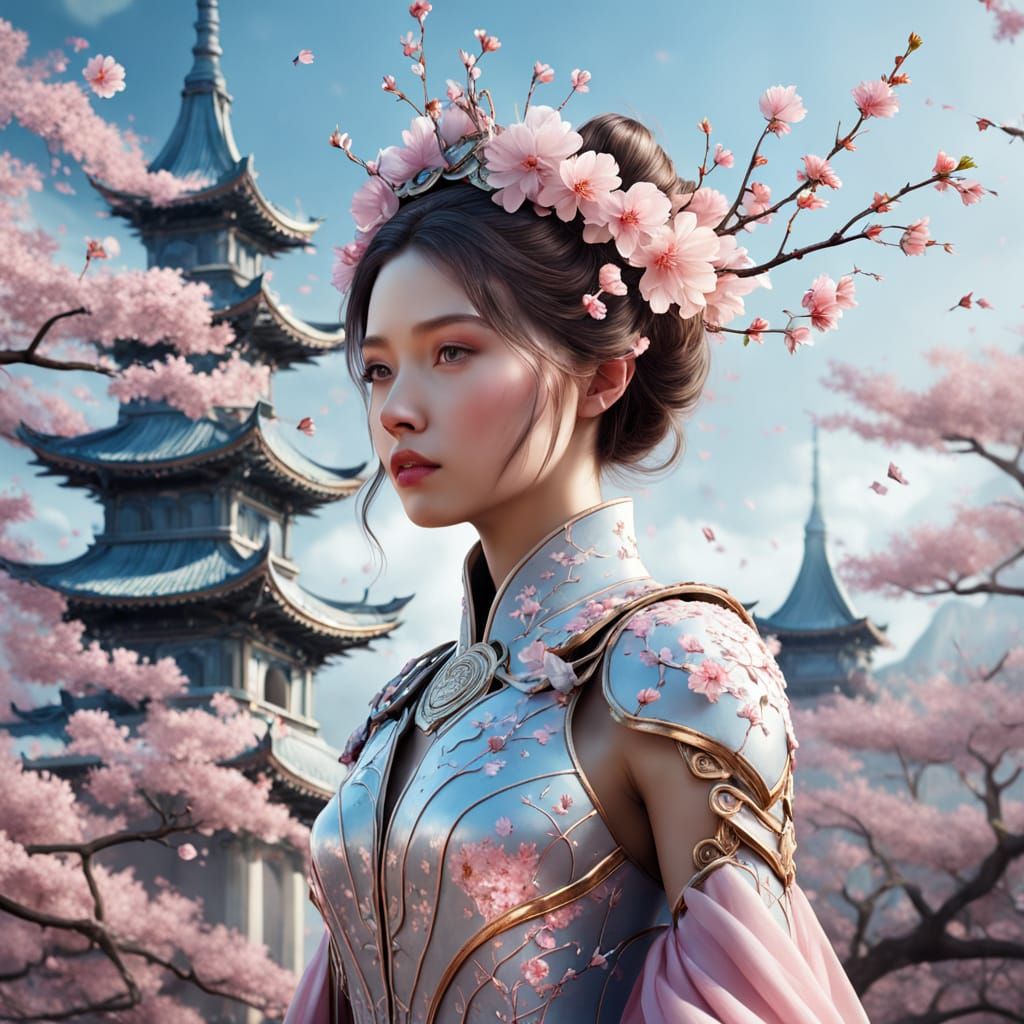 A digital art piece of a towering woman formed from cherry blossom branches. Pink petals surround her cracked porcelain skin and a shattered crown. The image is a whimsical fantasy in 8k resolution.