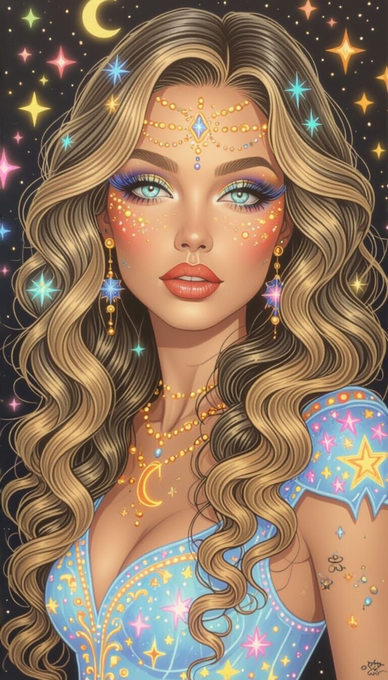 This image shows a beautiful enchantress with long black curly hair and piercing turquoise eyes, set against a backdrop of a starry night sky. The artwork has a surreal, psychedelic style with neon glowing elements.