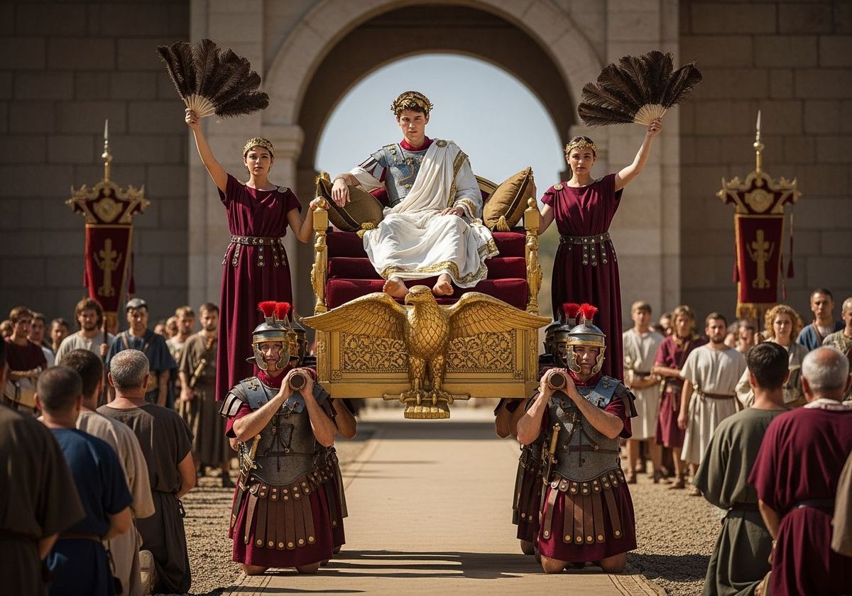 This image depicts a young Roman Emperor being carried on a golden, eagle-shaped litter by soldiers. Servants with fans attend him as he gestures to kneeling peasants, captured in a photograph with a shallow depth of field.