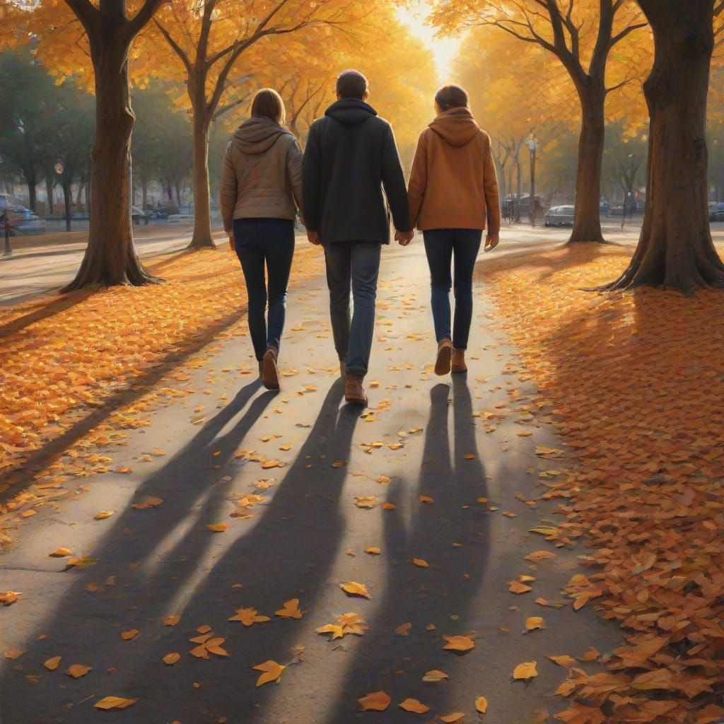 A hyperdetailed charcoal drawing of a couple walking through a park in autumn. Golden light illuminates the vibrant foliage and serene atmosphere, rendered with gentle colors.
