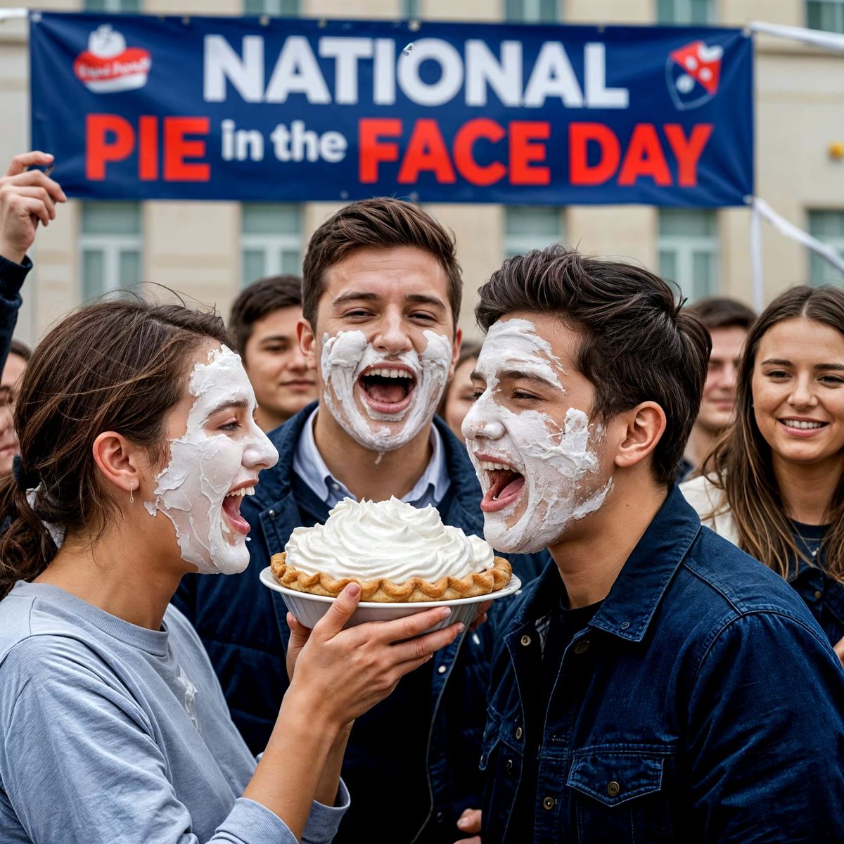 This image captures the messy, joyous chaos of National Pie in the Face Day, with people gleefully smashing whipped cream pies at a lively event.