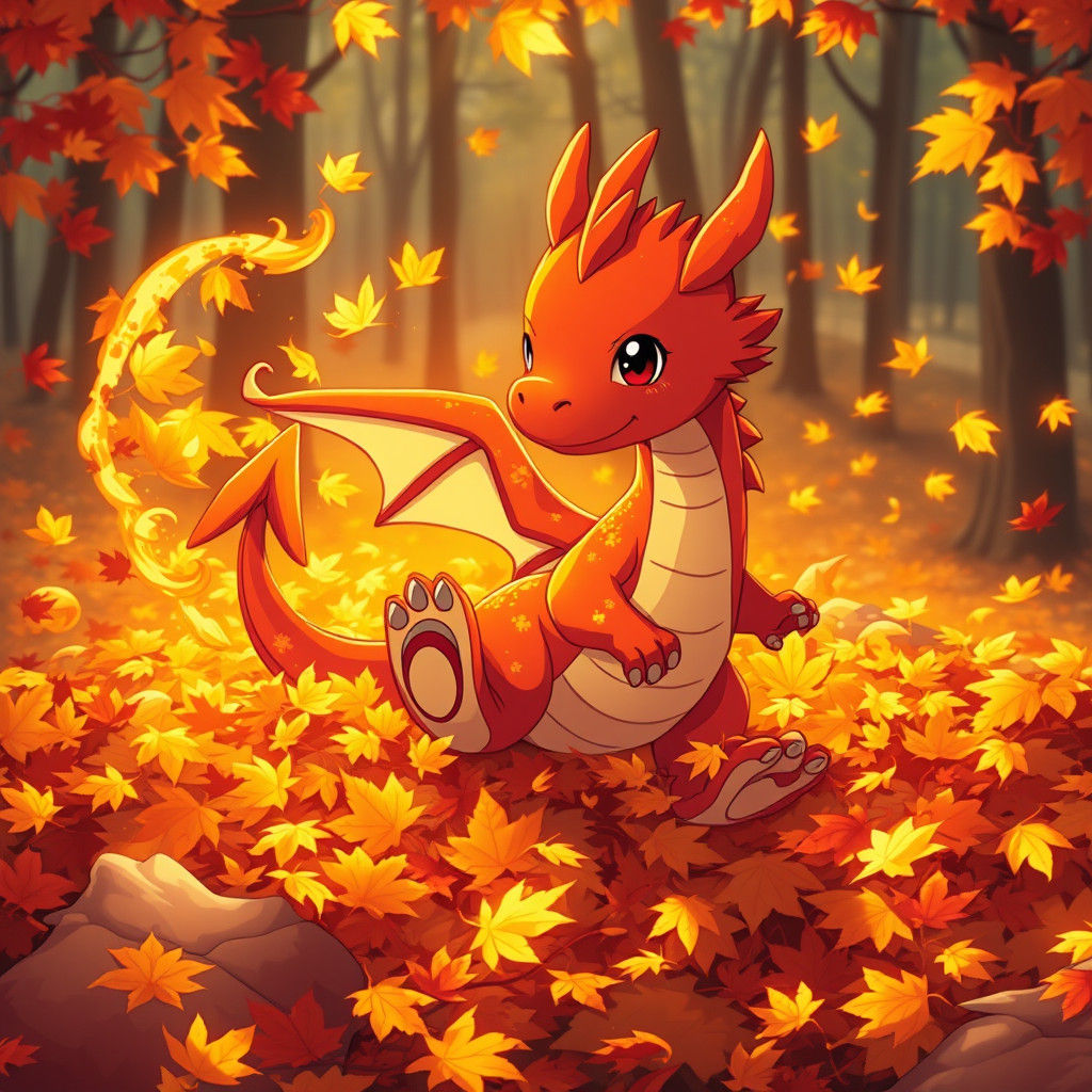 A vibrant image of a cute red dragon playing in autumn leaves. The artwork has a dynamic manga aesthetic with cel-shaded textures and rich colors, reminiscent of anime styles.