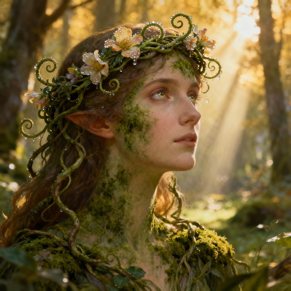 This image depicts a forest nymph adorned with a tiara of vines and flowers. Her eyes hold ancient wisdom, and her skin has a mossy texture. The scene is a sunlit glade in an old forest, rendered in a romantic fantasy illustration style.